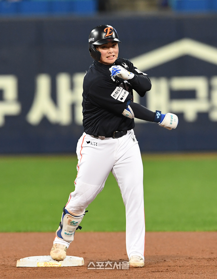 한화 김경문 감독(맨 오른쪽)이 21일 대구 삼성라이온즈파크에서 열린 2025 KBO리그 삼성과의 플레이오프 3차전에서 삼성에 승리한 뒤 선수들을 향해 박수를 보내고 있다. 2025. 10. 21.