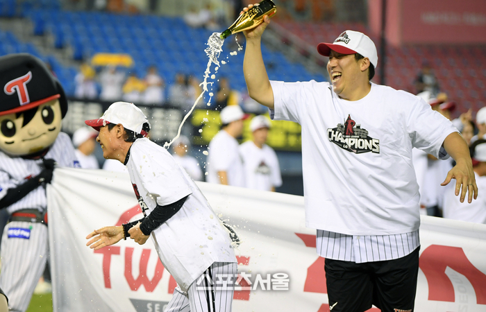 [포토] 김현수 ‘염경엽 감독에 시원한 샴페인 세례’