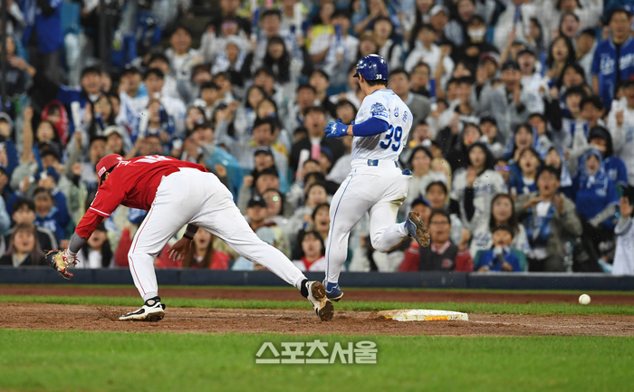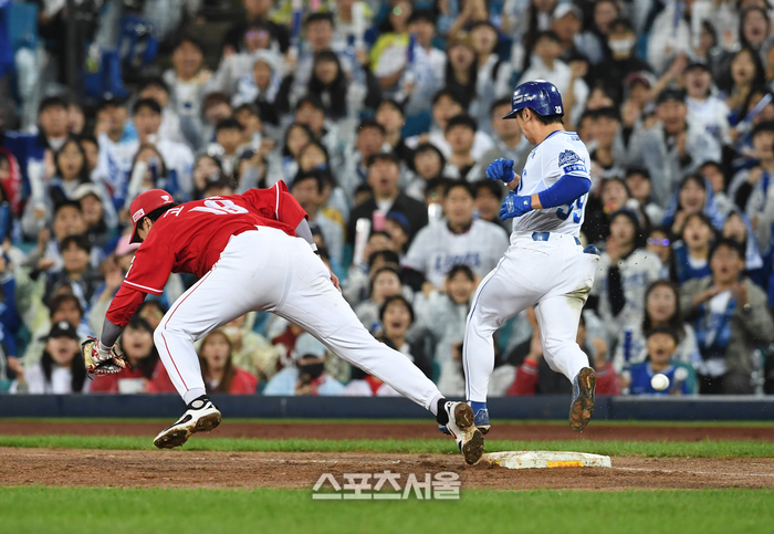 [포토]삼성 김지찬, 상대 실책을 놓치지 않는 득점