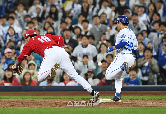[포토]고명준 옆으로 빠지는 안상현의 송구 실책