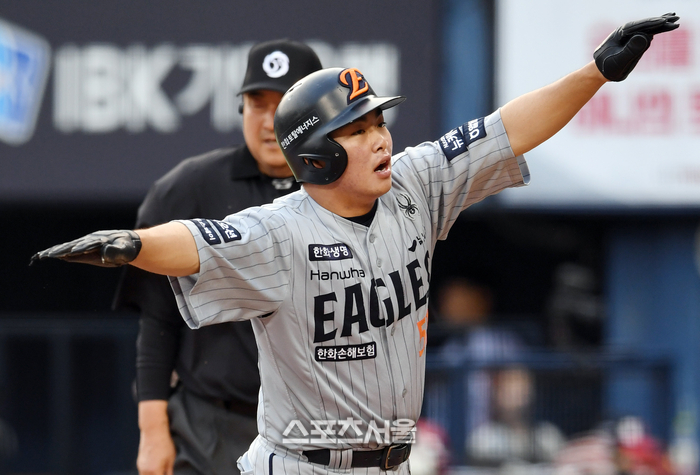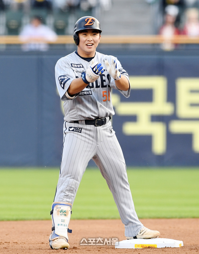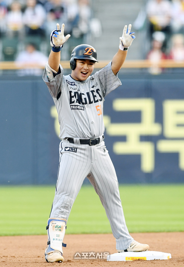 [포토]1타점 2루타에 기뻐하는 한화 문현빈