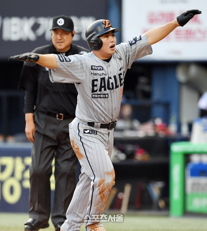 [포토]2루타에 이어 득점까지 하는 한화 문현빈