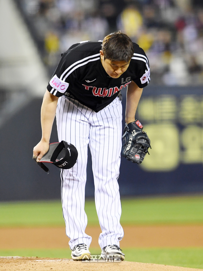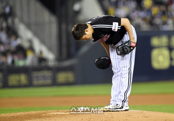 [포토]LG 김강률, 친정팀 두산전 등판하며 90도 인사