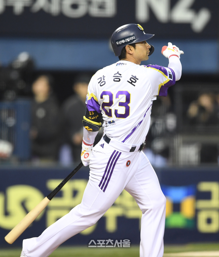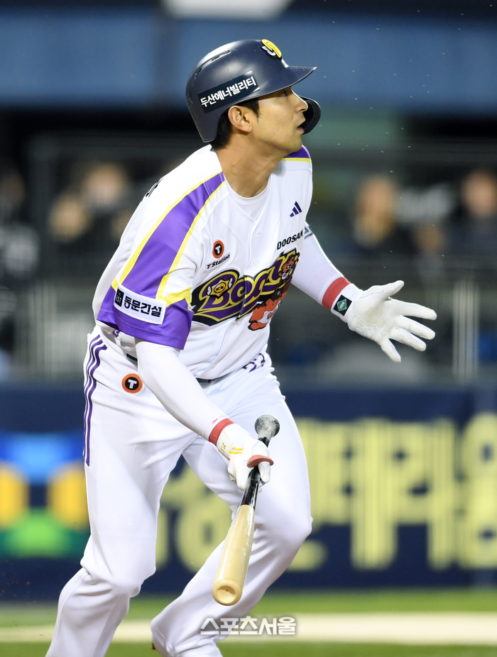 [포토]두산 강승호, LG 선발 최채흥 상대 1타점 2루타