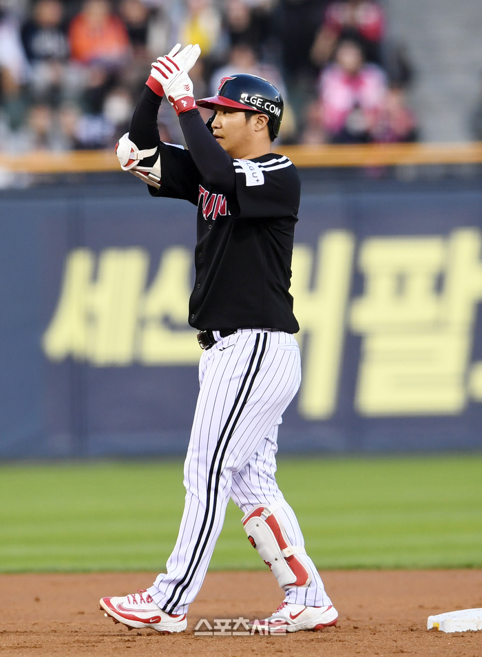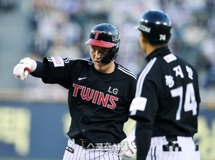 [포토]2루타로 1점 추가하는 LG 문보경