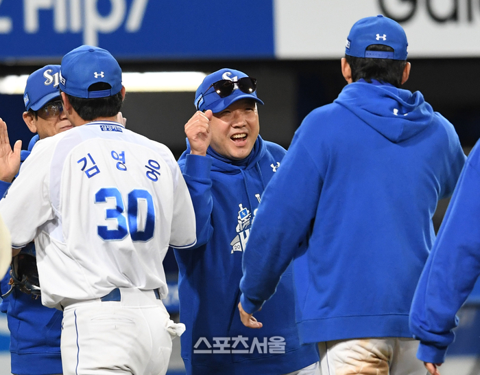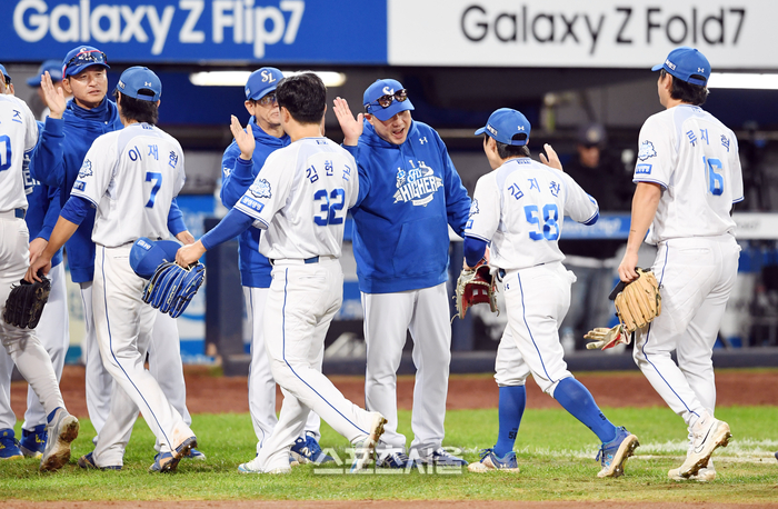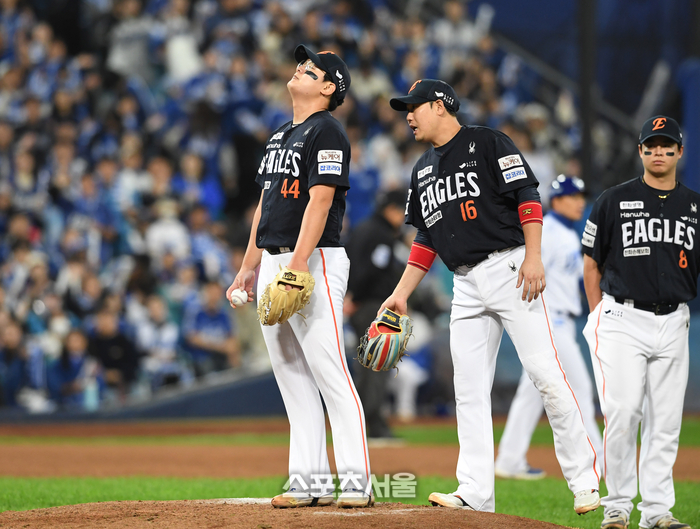 한화 투수 김범수가 22일 대구 삼성라이온즈파크에서 열린 2025 KBO리그 삼성과의 플레이오프 4차전 4회말 2사 2루 상황에서 삼성 박병호를 삼진으로 잡아낸 뒤 포효하고 있다. 2025. 10. 22.